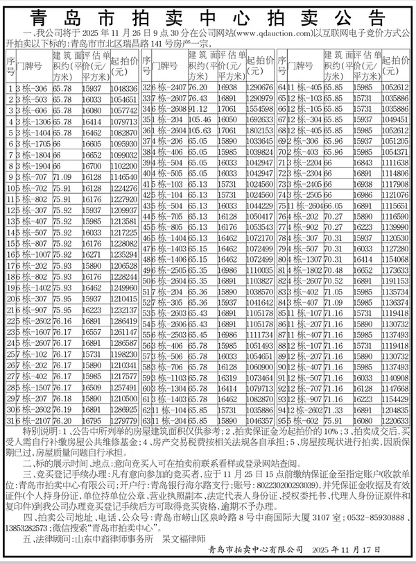 20251126青岛市瑞昌路141号房产一宗拍卖会 > > 【60】3栋-1304